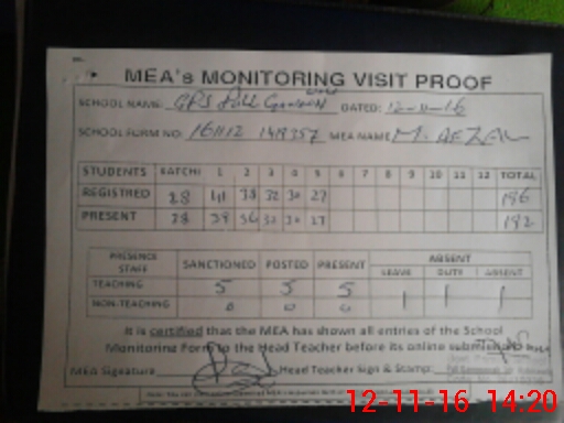 | Attendance Register | Head Teacher | MEA with School | Visit Proof |