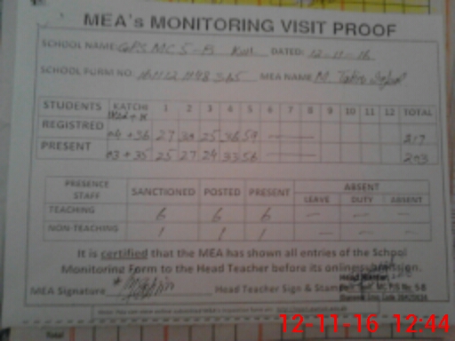 | Attendance Register | Head Teacher | MEA with School | Visit Proof |