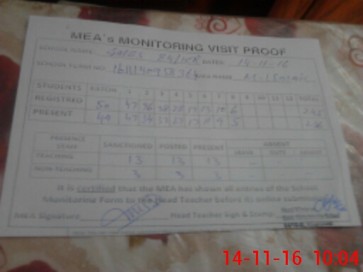 | Attendance Register | Head Teacher | MEA with School | Visit Proof |