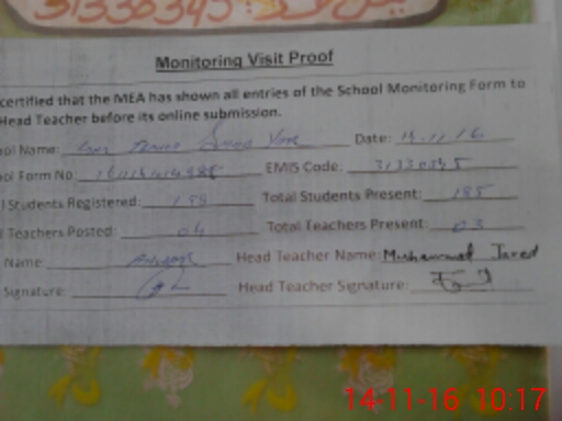 | Attendance Register | Head Teacher | MEA with School | Visit Proof |