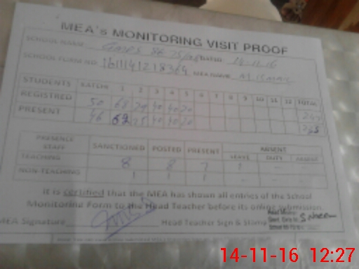 | Attendance Register | Head Teacher | MEA with School | Visit Proof |