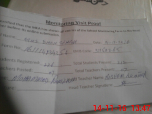| Attendance Register | Head Teacher | MEA with School | Visit Proof |
