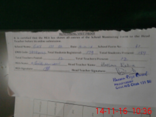 | Attendance Register | Head Teacher | MEA with School | Visit Proof |