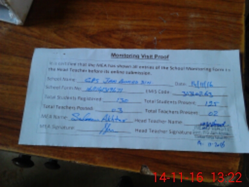 | Attendance Register | Head Teacher | MEA with School | Visit Proof |