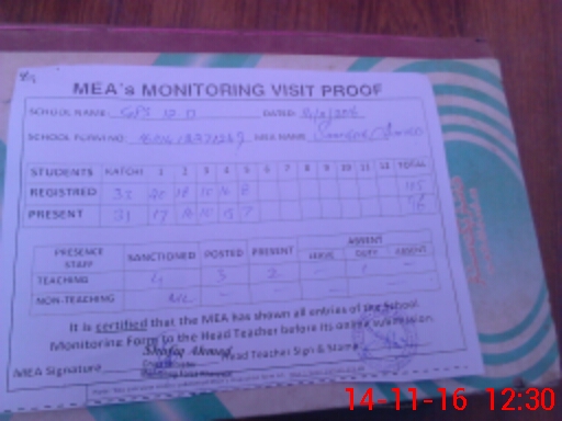 | Attendance Register | Head Teacher | MEA with School | Visit Proof |
