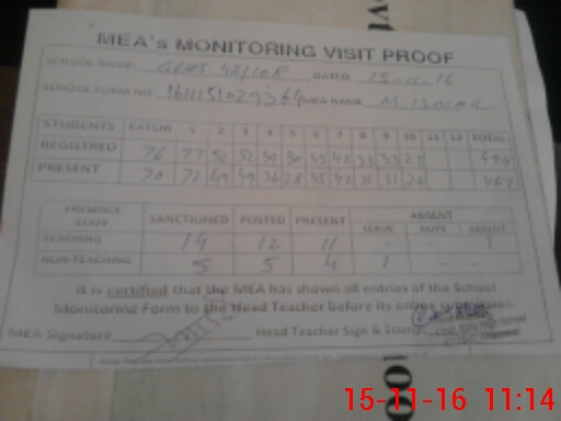 | Attendance Register | Head Teacher | MEA with School | Visit Proof |