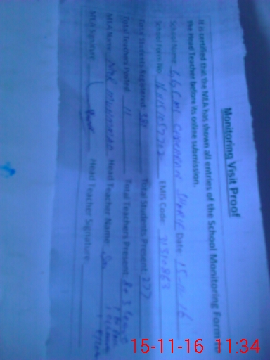 | Total no. of Classrooms: 6 No. of Classrooms Used for Teaching: 6 No. of Classrooms Storing Old Furniture, FTBs, etc: 0Comments if Any: Satisfactory visit proof not signed by head |