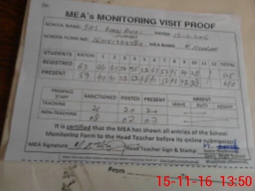| Attendance Register | Head Teacher | MEA with School | Visit Proof |
