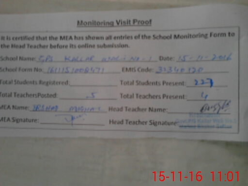 | EMIS Code: 32340120 | Name of School: GPS KALLAR WALI NO.1 | |||