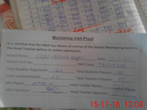 | Attendance Register | Head Teacher | MEA with School | Visit Proof |