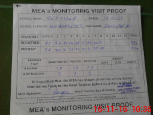 | Attendance Register | Head Teacher | MEA with School | Visit Proof |