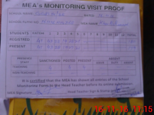 | Attendance Register | Head Teacher | MEA with School | Visit Proof |