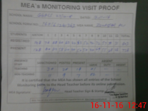 | Attendance Register | Head Teacher | MEA with School | Visit Proof |
