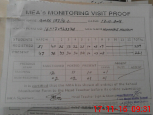 | Attendance Register | Head Teacher | MEA with School | Visit Proof |