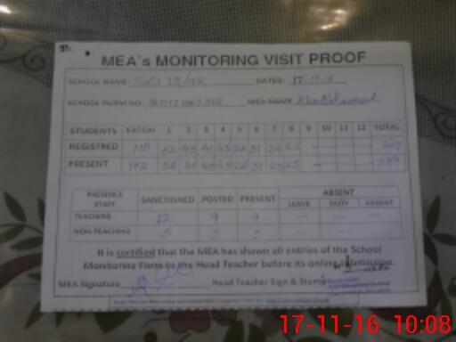 | Attendance Register | Head Teacher | MEA with School | Visit Proof |