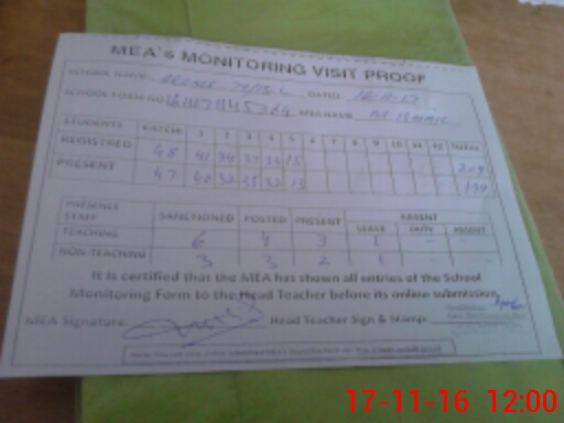 | Attendance Register | Head Teacher | MEA with School | Visit Proof |