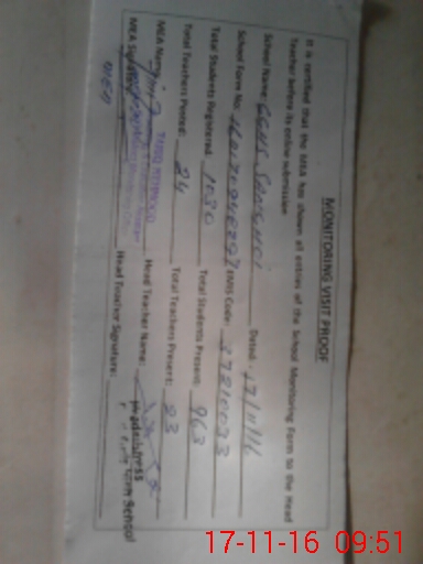 | School Visited by School Health & Nutrition Supervisor (No. of Visits) | 1 | Name1: | SYED ZAKI BAQAR SHAH | Name2: | |