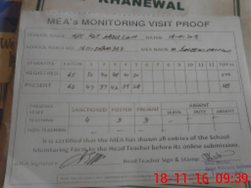 | EMIS Code: 36420217 | Name of School: GPS KOT ABDULLAH, P/O MAKHDOOM PUR, KHANEWAL | |||