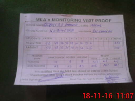 | Attendance Register | Head Teacher | MEA with School | Visit Proof |