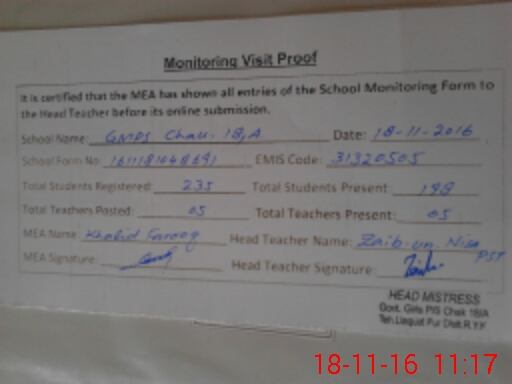 | EMIS Code: 31320505 | Name of School: GMPS CHAK NO.18/A | |||