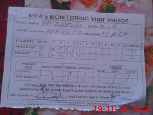 | Attendance Register | Head Teacher | MEA with School | Visit Proof |
