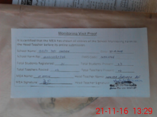 | Attendance Register | Head Teacher | MEA with School | Visit Proof |
