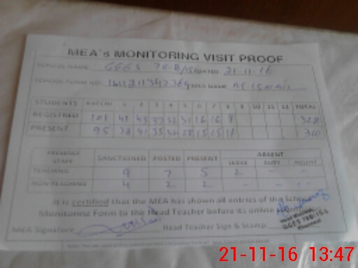| Attendance Register | Head Teacher | MEA with School | Visit Proof |
