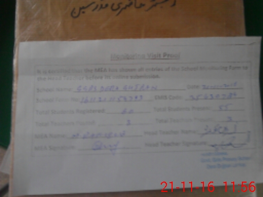 | Attendance Register | Head Teacher | MEA with School | Visit Proof |
