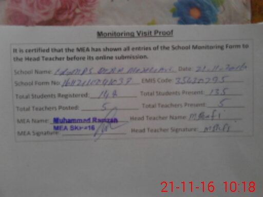 | EMIS Code: 35430795 | Name of School: GGPS MODEL DERA MALLIAN SHARQI | |||