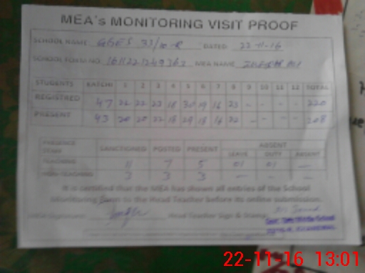 | Attendance Register | Head Teacher | MEA with School | Visit Proof |