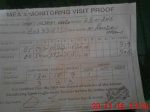 | Attendance Register | Head Teacher | MEA with School | Visit Proof |