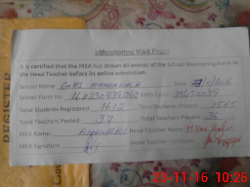 | Certified that this School was Inspected by the Undersigned MEA/DMO Today and the Information Stated Above is as Per Record. | |||||