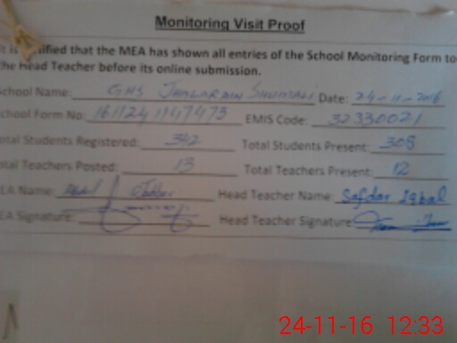 | Attendance Register | Head Teacher | MEA with School | Visit Proof |