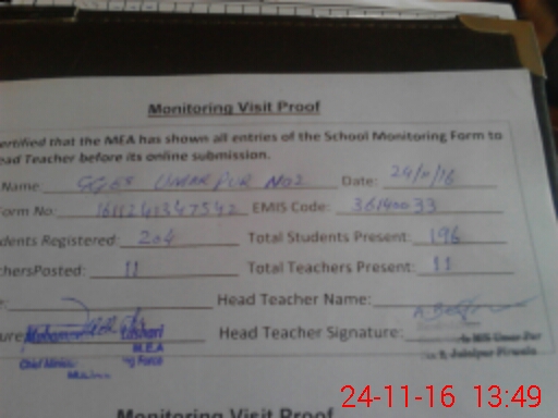 | Attendance Register | Head Teacher | MEA with School | Visit Proof |