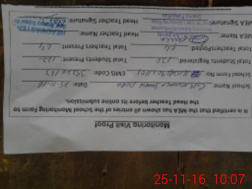 | Attendance Register | Head Teacher | MEA with School | Visit Proof |