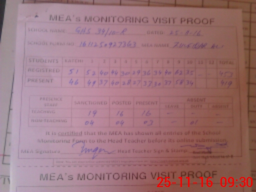 | Attendance Register | Head Teacher | MEA with School | Visit Proof |