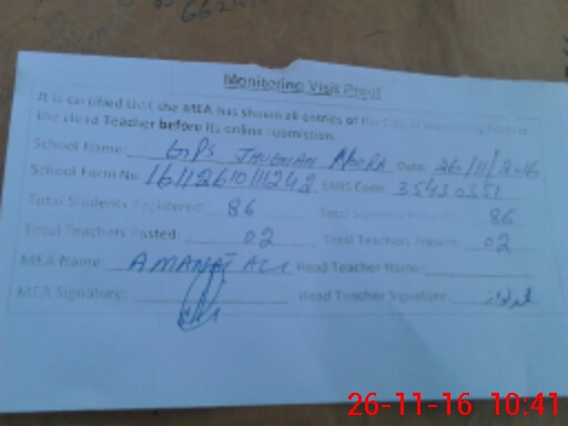 | Attendance Register | Head Teacher | MEA with School | Visit Proof |