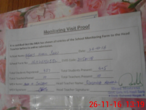 | Attendance Register | Head Teacher | MEA with School | Visit Proof |