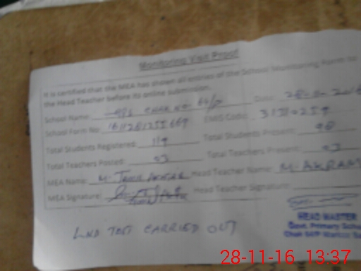 | Attendance Register | Head Teacher | MEA with School | Visit Proof |