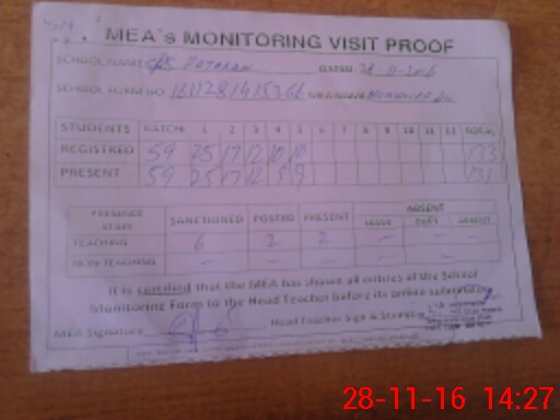 | Attendance Register | Head Teacher | MEA with School | Visit Proof |