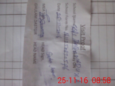 | School Visited by School Health & Nutrition Supervisor (No. of Visits) | 1 | Name1: | Muzammil Shah | Name2: | |