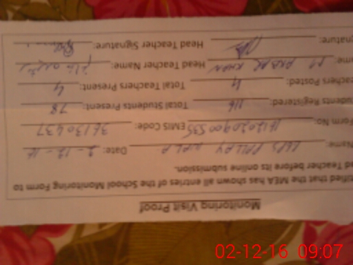 | Attendance Register | Head Teacher | MEA with School | Visit Proof |