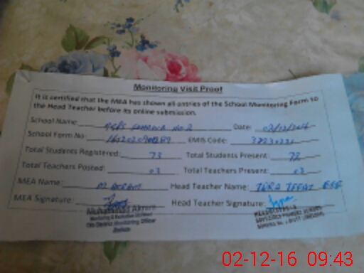 | Attendance Register | Head Teacher | MEA with School | Visit Proof |
