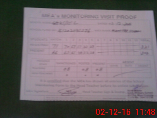 | Attendance Register | Head Teacher | MEA with School | Visit Proof |