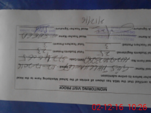 | Monitoring Date: 02-12-2016 | Start Time: 02-12-2016 09:43 AM | End Time: 02-12-2016 10:26 AM | Name of MEA: ZV**** | |