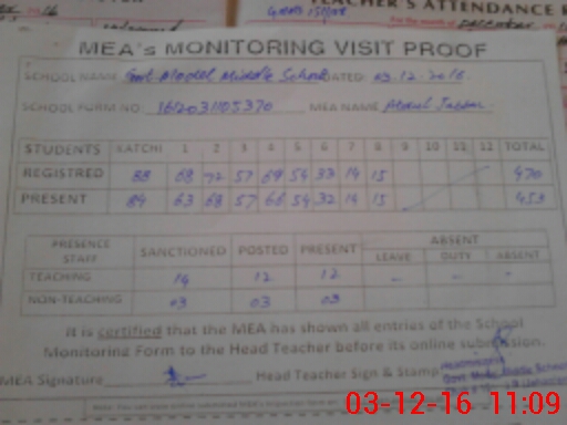 | Attendance Register | Head Teacher | MEA with School | Visit Proof |