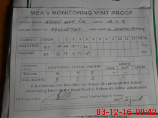 | Attendance Register | Head Teacher | MEA with School | Visit Proof |