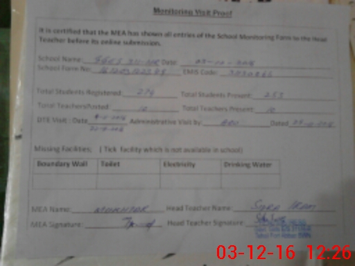 | School Visited by School Health & Nutrition Supervisor (No. of Visits) | 1 | Name1: | Usman Ilyas | Name2: | Nil |