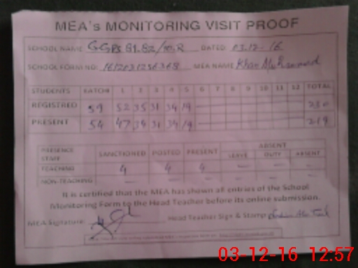 | Attendance Register | Head Teacher | MEA with School | Visit Proof |