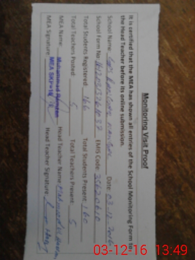 | Attendance Register | Head Teacher | MEA with School | Visit Proof |